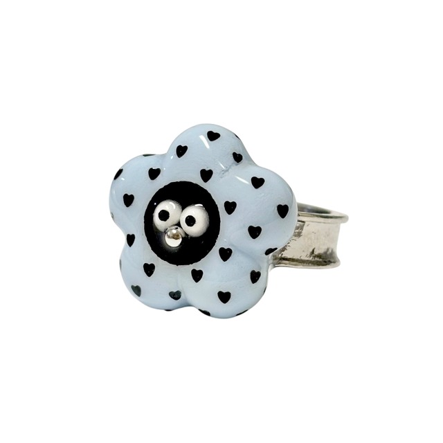 \16時までのご注文で当日発送致します!/ パステルブルーと黒の色合いがかわいいハートのドット柄お花ちゃんリングです。 リング部分はシルバーカラーです。 ◎素材 金属、粘土、レジン ◎サイズ 10-11号 ◎ご注意 ・ハンドメイドのため、既製品よりデリケートに出来ております。強く引っ張ったりするとパーツが取れてしまう場合がございますのでお取扱いにご注意下さい。 ・写真と実物の色合いが異なる場合がありますので、予めご了承ください。 ・黄ばみや劣化を防ぐため、直射日光を避けて保管して頂き、身につけてのご入浴はお控え下さい。 ・普通郵便でお届けします。 ・土日祝は当日発送できない場合がございます。