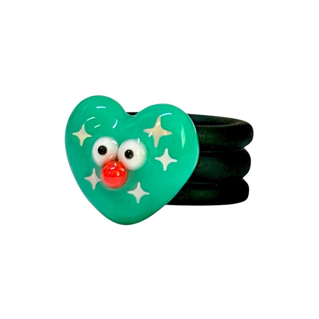 真っ黒でマット素材のリングに赤鼻エメラルドグリーンのハートちゃんがついています。キラキラしていてかわいいです。