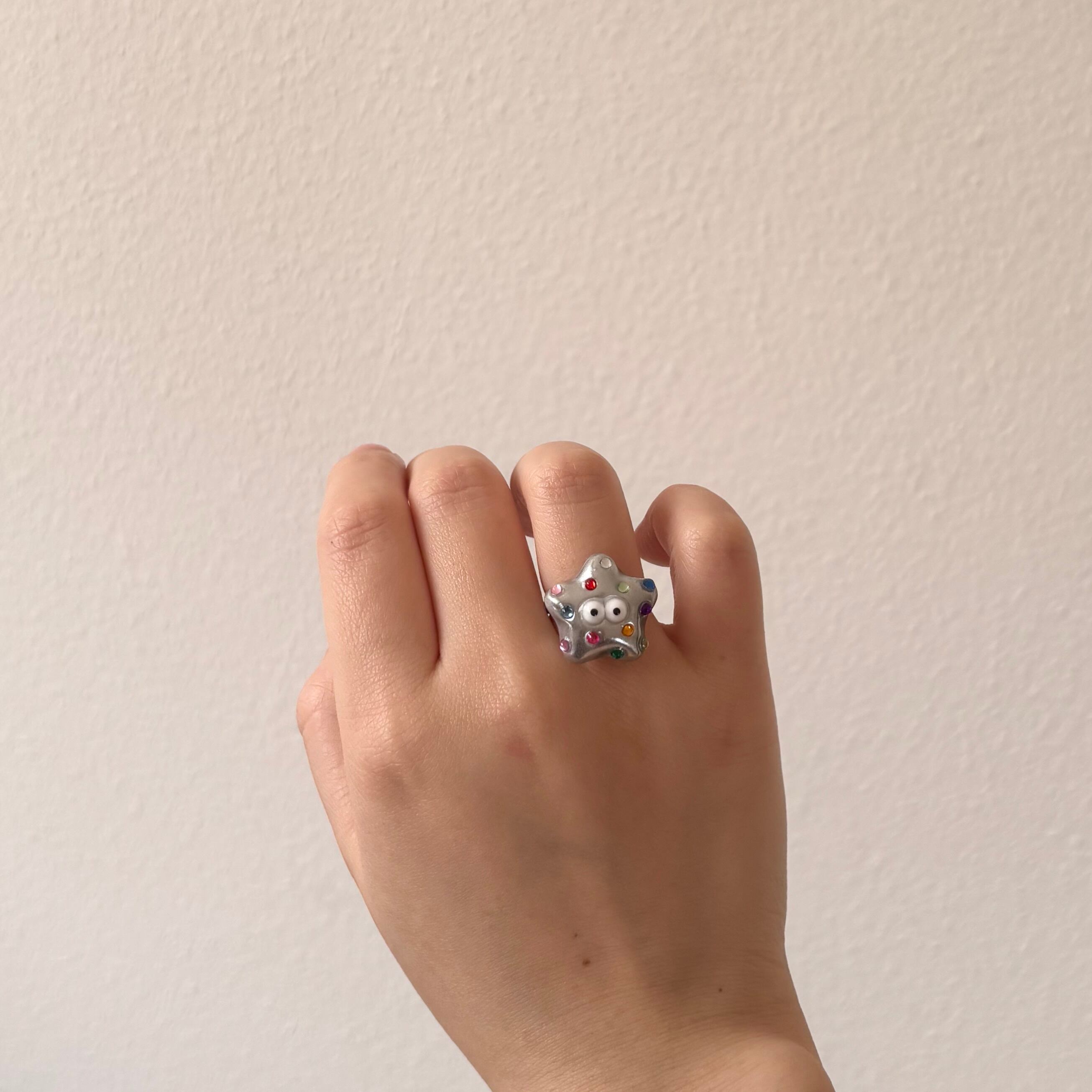人気のシルバーカラーの星ちゃんリングです。カラフルなキラキラストーンを散りばめています。