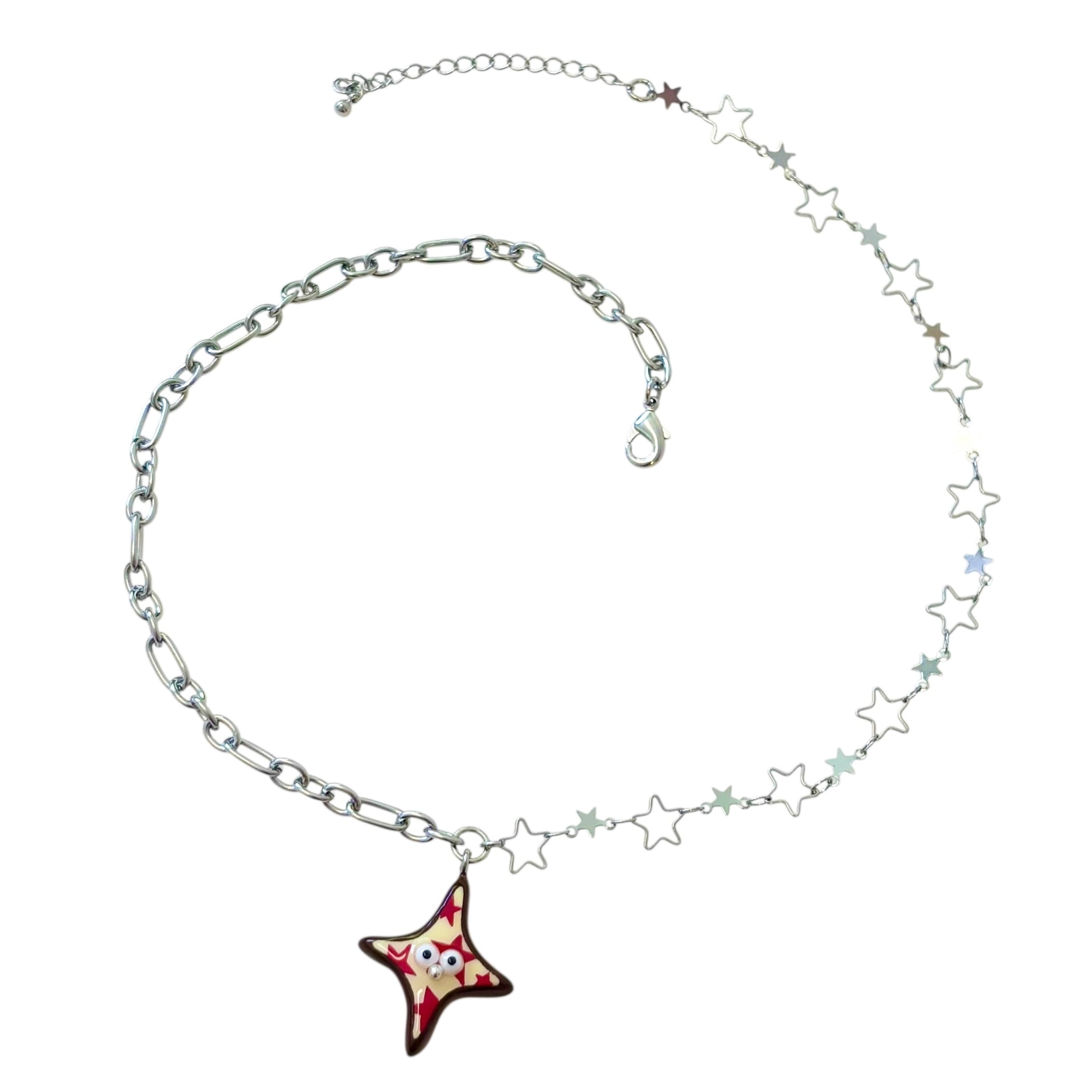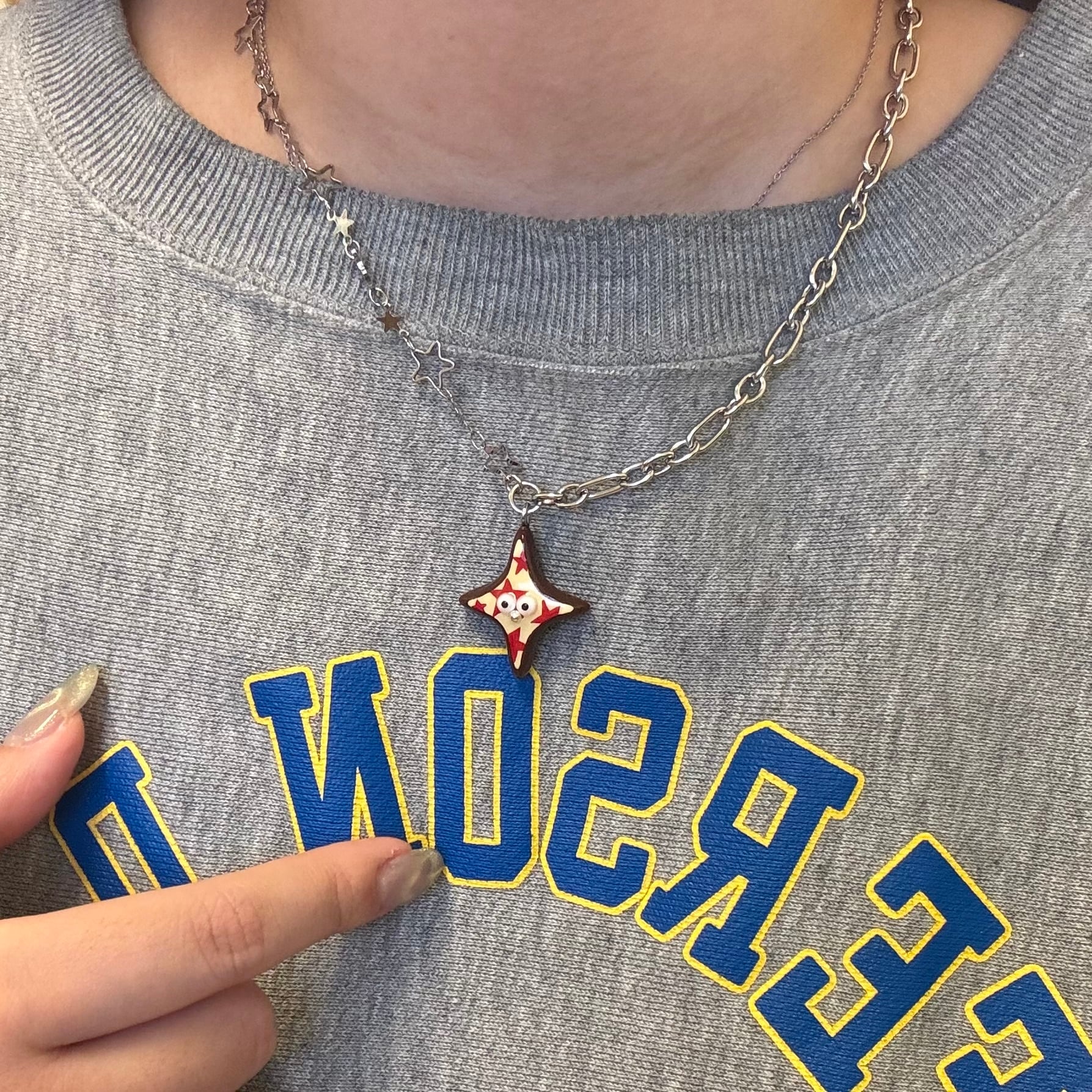 パステルイエローに赤の星柄を描いた星型のネックレスです。枠は茶色でシルバーの鼻がついています。