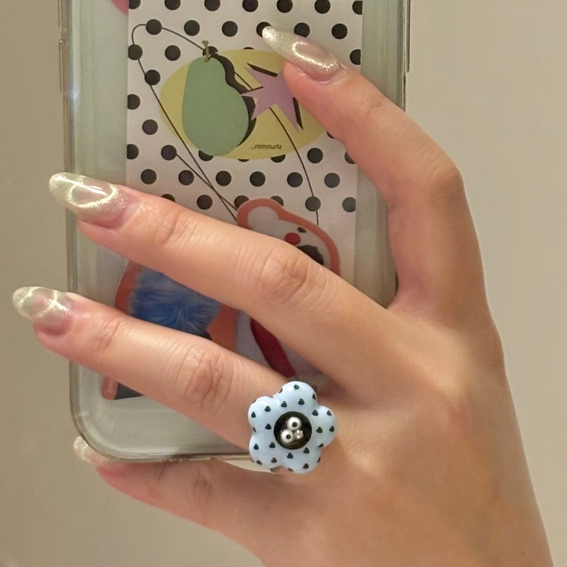 パステルブルーと黒の色合いがかわいいハートのドット柄お花ちゃんリングです。