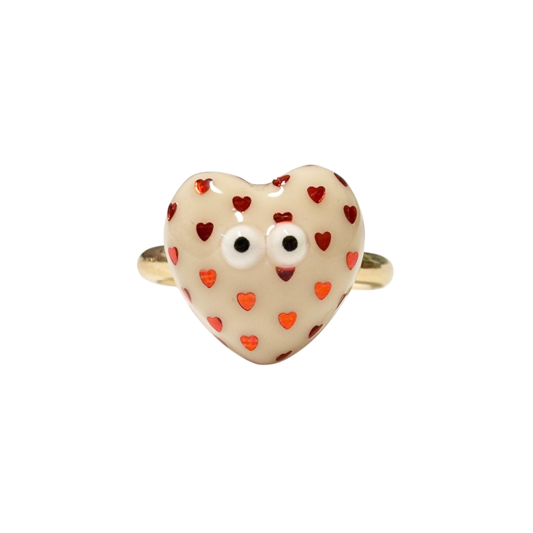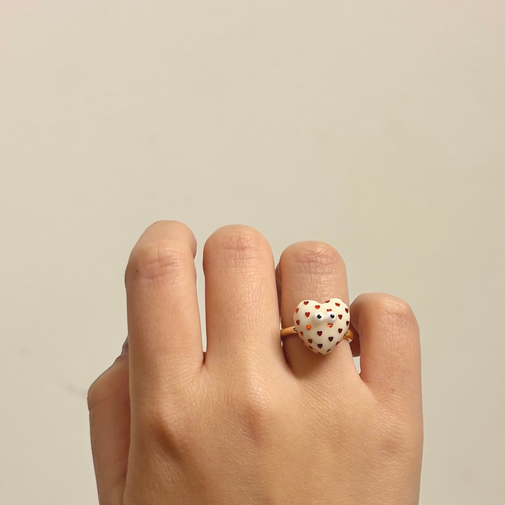 アイボリーで光沢のある赤のハートドット柄のハートちゃんリングです。