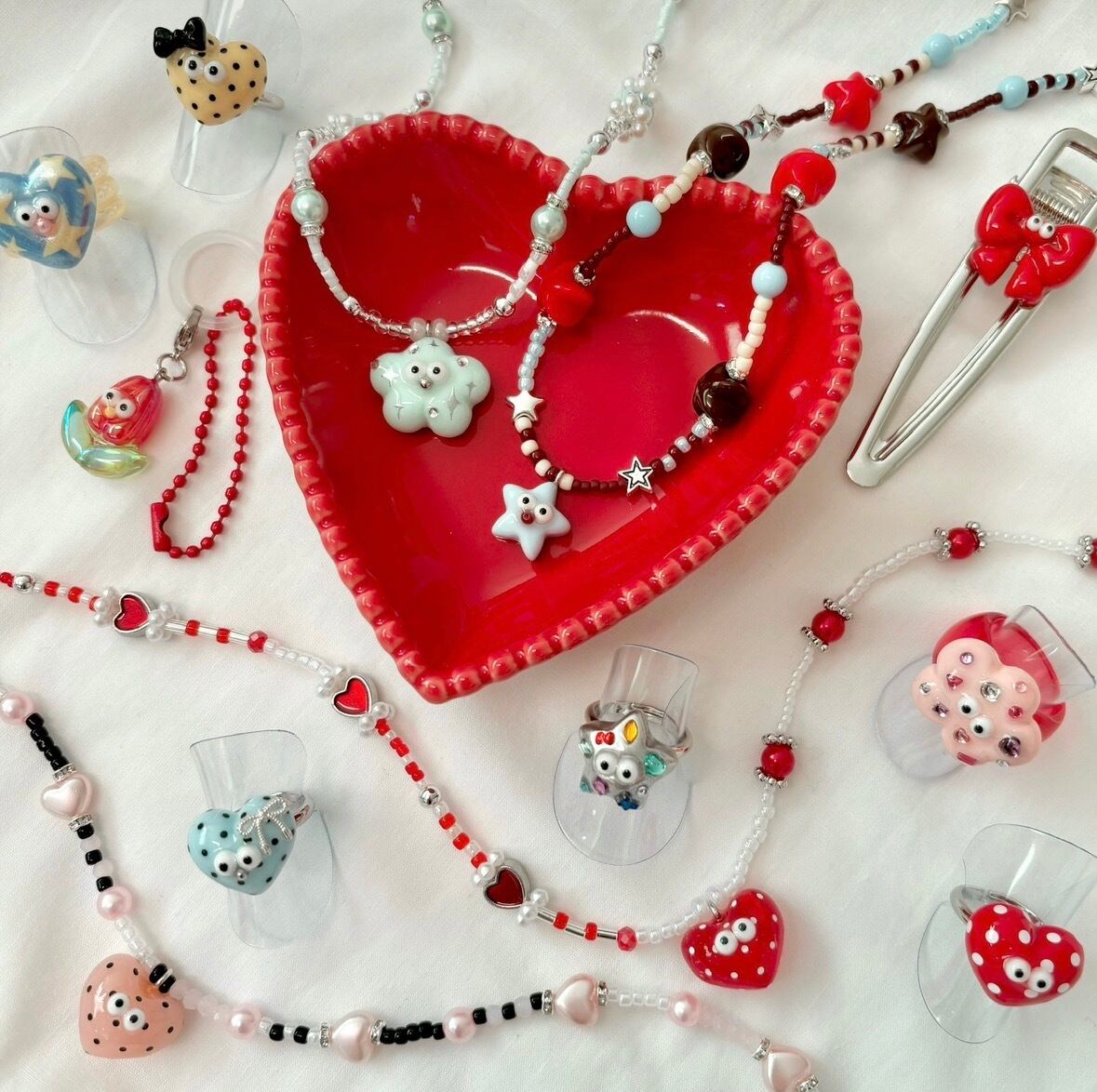 ・ハンドメイドのため、既製品よりデリケートに出来ております。強く引っ張ったりするとパーツが取れてしまう場合がございますのでお取扱いにご注意下さい。