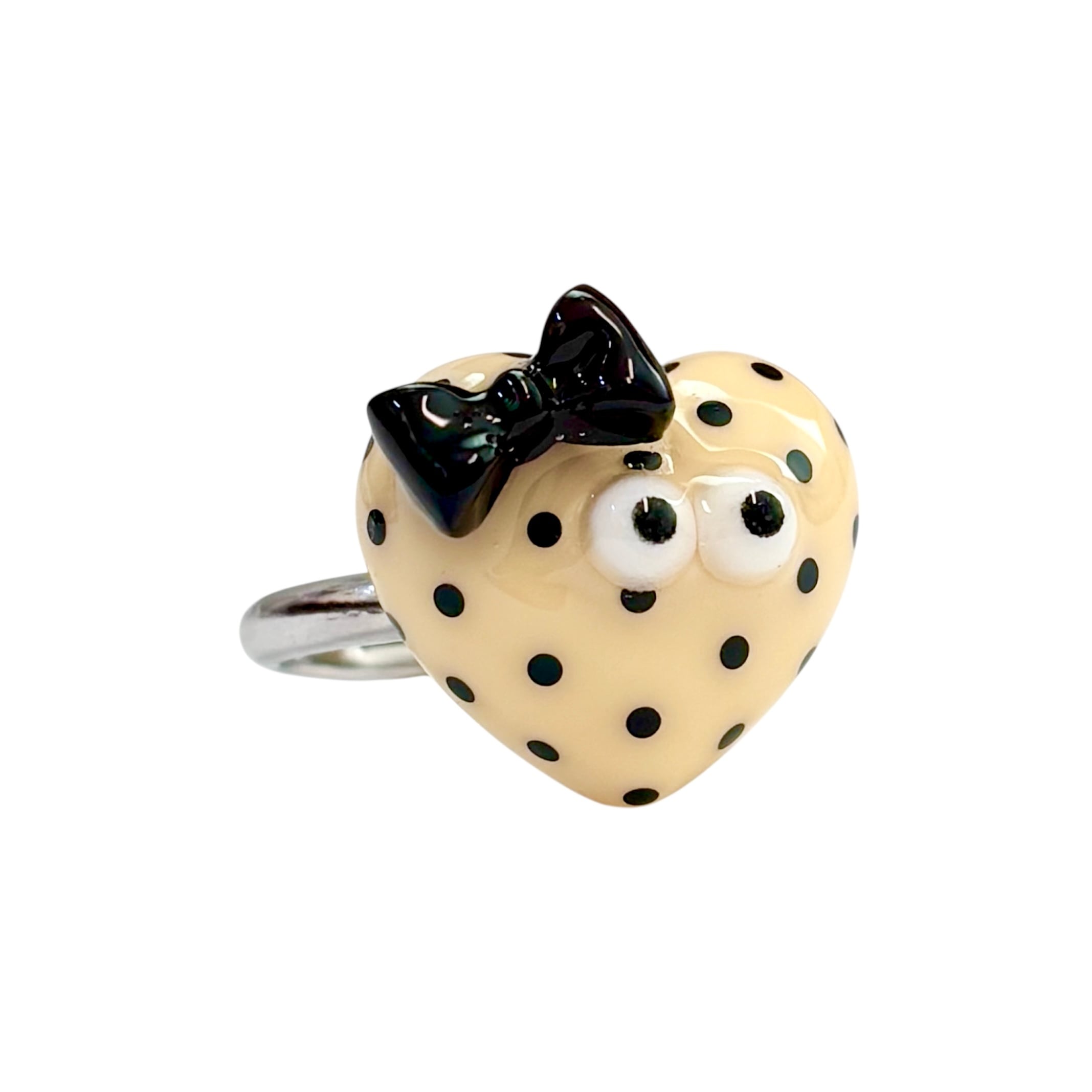 パステルイエローに黒ドットのハートちゃんリングです。リボンがついててとってもかわいいです。